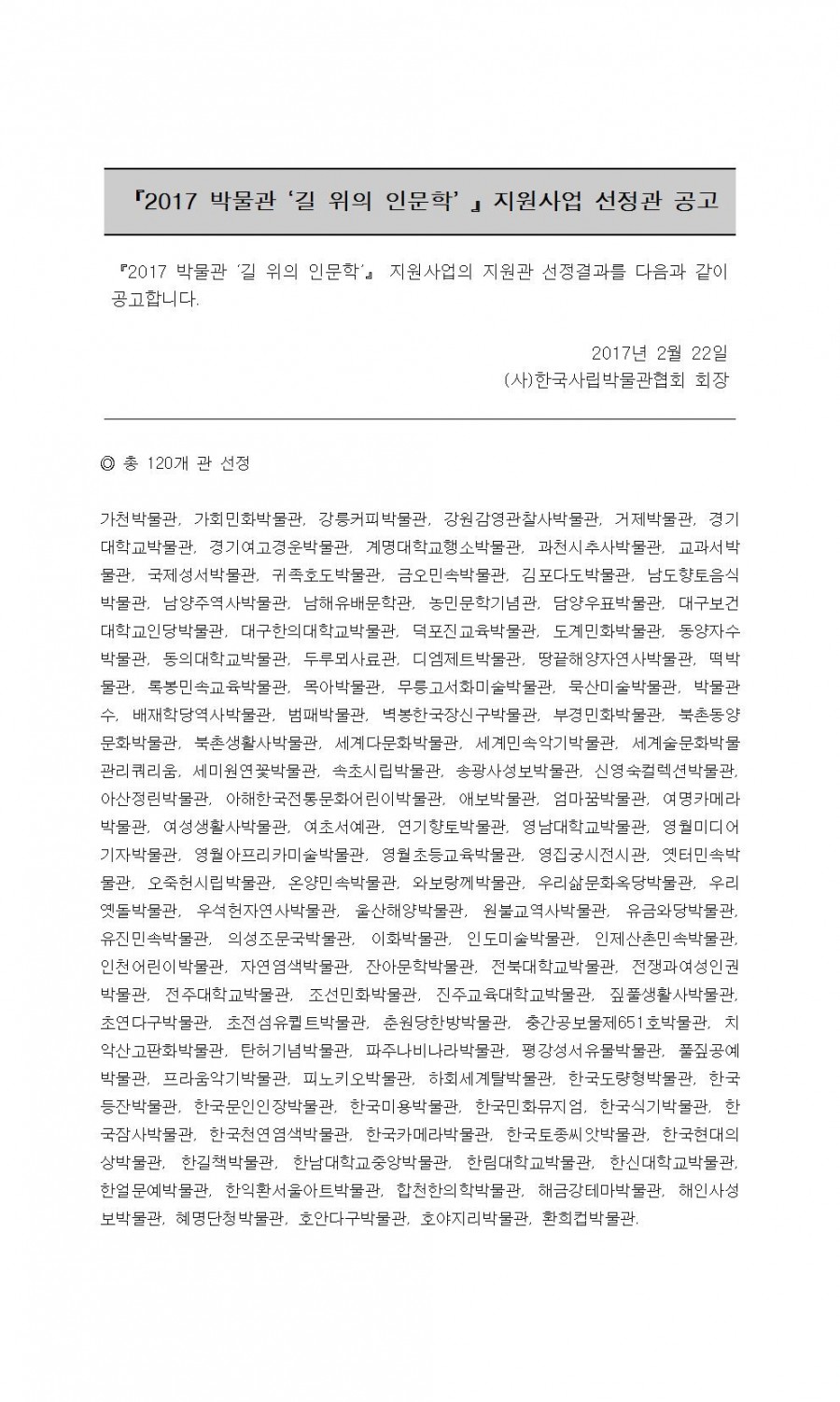 2017 박물관 길 위의 인문학 지원사업 선정관 발표 페이지 정보 작성자 관리자 작성일17-02-22 20:00 조회42,430회 댓글0건 관련링크 이전글 다음글 목록 본문 댓글목록 등록된 댓글이 없습니다. 이전글 다음글 목록