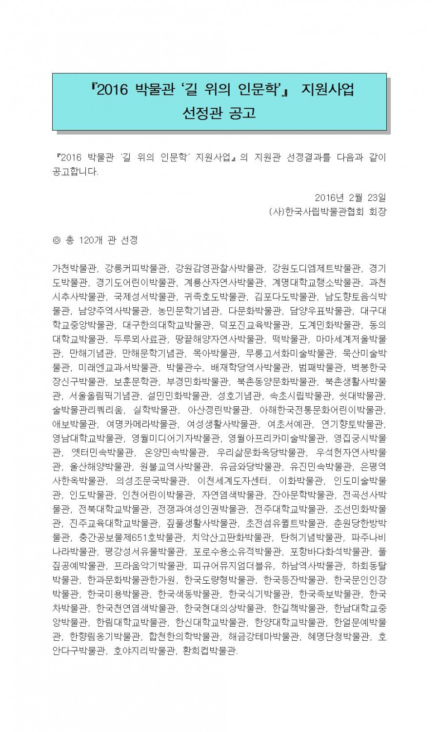 2016 박물관 '길 위의 인문학' 지원사업 선정 발표 페이지 정보 작성자 관리자 작성일16-02-23 17:04 조회42,576회 댓글0건 관련링크 이전글 다음글 목록 본문 댓글목록 등록된 댓글이 없습니다. 이전글 다음글 목록