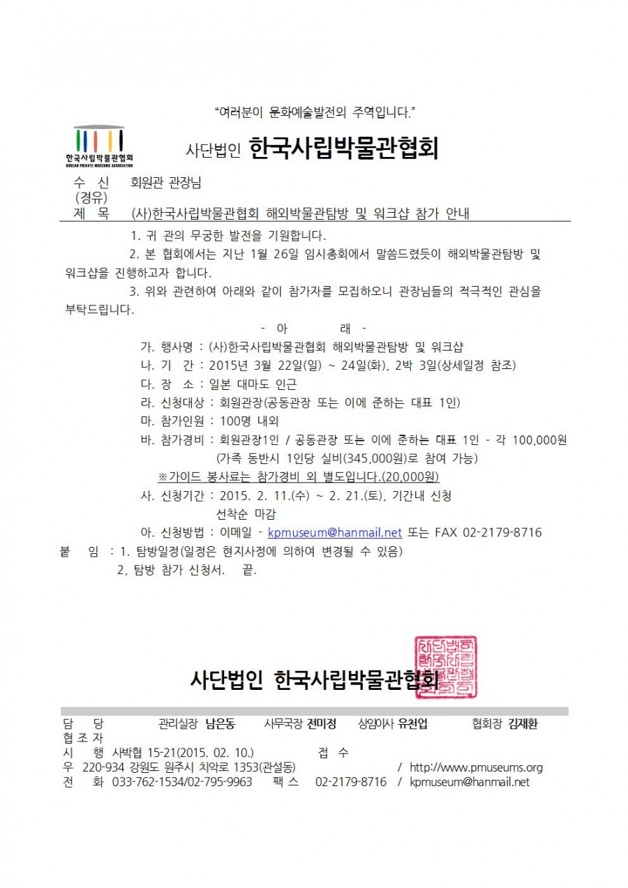 (사)한국사립박물관협회 해외박물관탐방 및 워크샵 안내