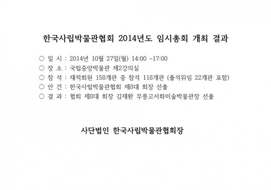 한국사립박물관협회 2014년도 임시총회 개최 결과 페이지 정보 작성자 관리자 작성일14-10-28 14:42 조회42,108회 댓글0건 관련링크 이전글 다음글 목록 본문 댓글목록 등록된 댓글이 없습니다. 이전글 다음글 목록
