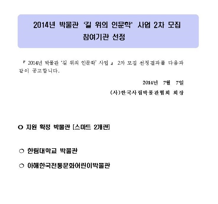 [인문학] 2014 박물관 길 위의 인문학 2차 기관모집 선정결과발표 페이지 정보 작성자 관리자 작성일14-07-07 14:30 조회40,093회 댓글0건 관련링크 이전글 다음글 목록 본문 댓글목록 등록된 댓글이 없습니다. 이전글 다음글 목록