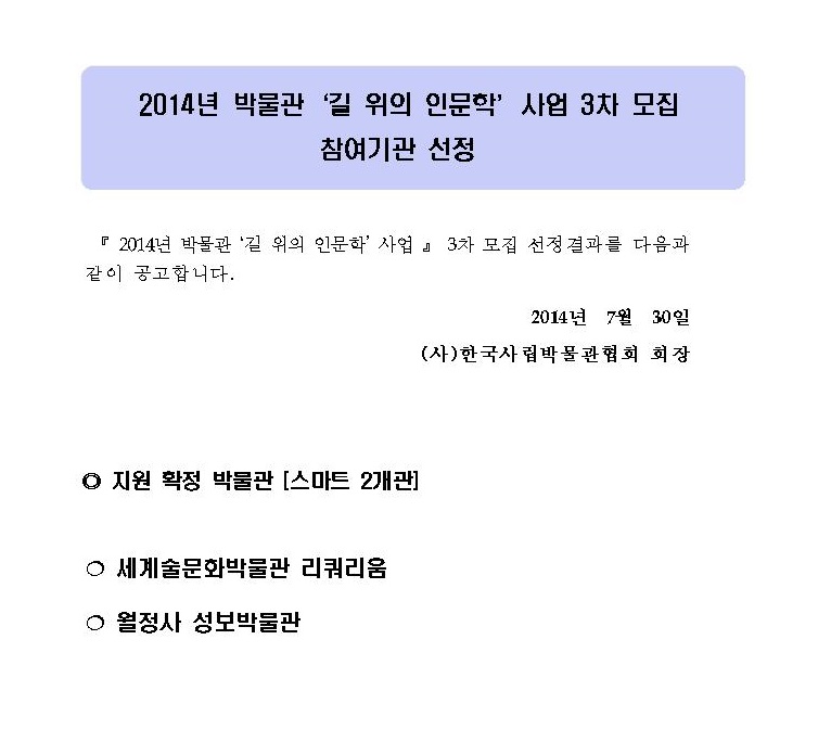 [인문학] 2014 박물관 길 위의 인문학 3차 기관모집 선정결과발표 페이지 정보 작성자 관리자 작성일14-07-30 14:31 조회39,379회 댓글0건 관련링크 이전글 다음글 목록 본문 댓글목록 등록된 댓글이 없습니다. 이전글 다음글 목록