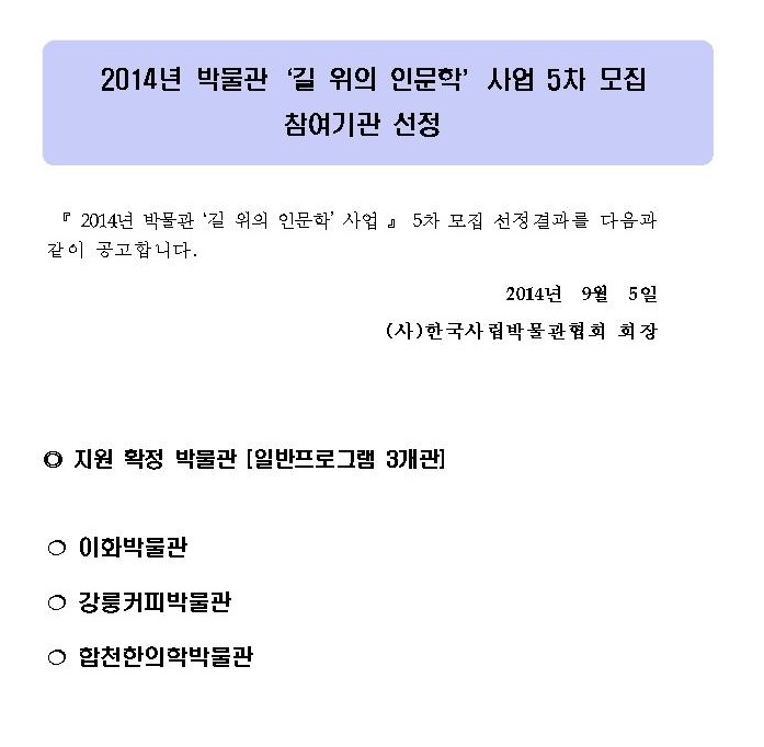2014 박물관 길 위의 인문학 5차 기관모집 선정결과발표 페이지 정보 작성자 관리자 작성일14-09-05 14:34 조회40,472회 댓글0건 관련링크 이전글 다음글 목록 본문 댓글목록 등록된 댓글이 없습니다. 이전글 다음글 목록