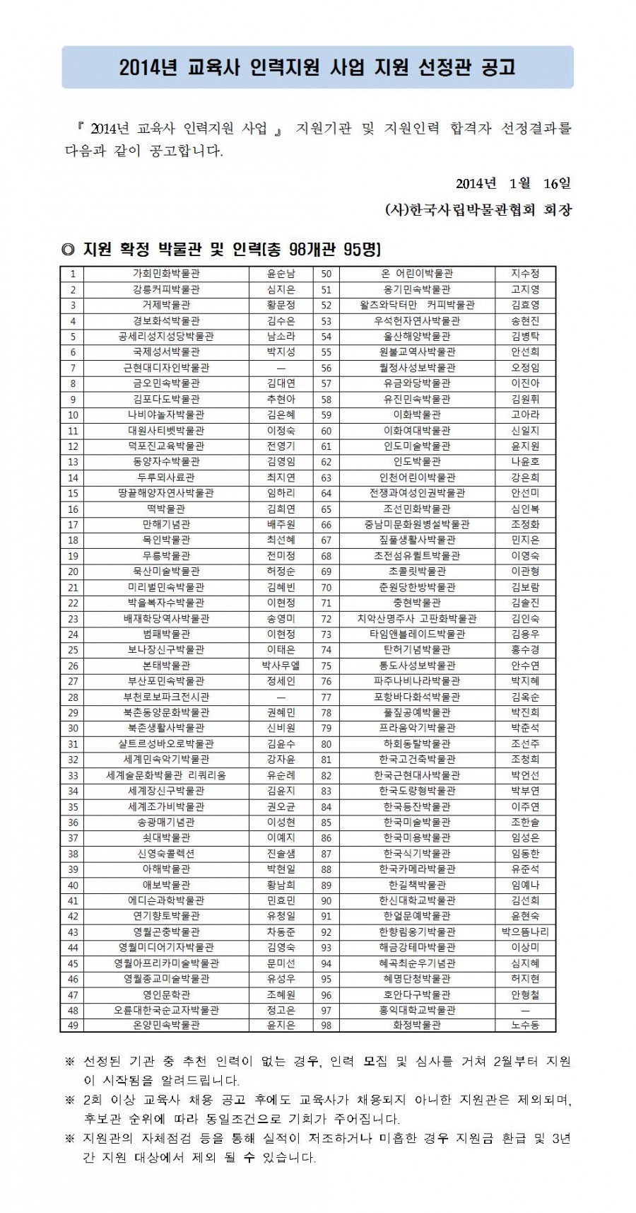 『 2014년 교육사 인력 지원사업 』 지원기관 선정 공고 페이지 정보 작성자 관리자 작성일14-01-16 14:05 조회37,814회 댓글0건 관련링크 이전글 다음글 목록 본문 댓글목록 등록된 댓글이 없습니다. 이전글 다음글 목록