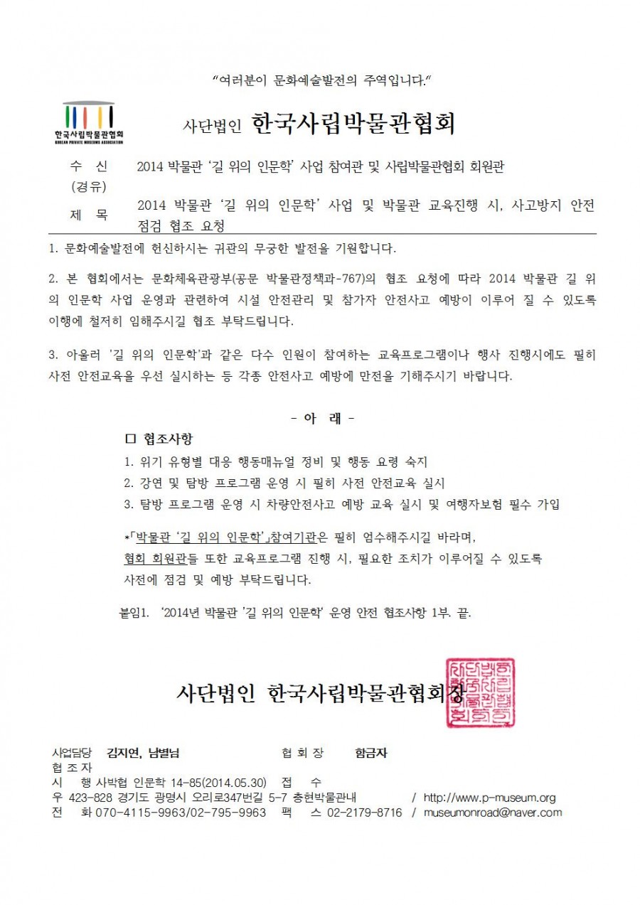 2014 박물관 ‘길 위의 인문학’ 사업 및 박물관 교육진행 시, 사고방지 안전 점검 협조 요청