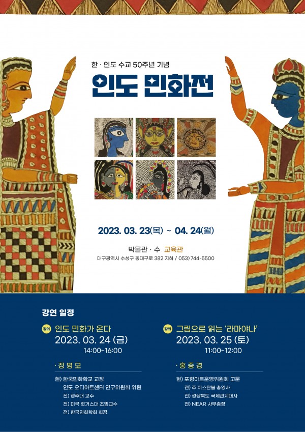 [박물관 수] 인도민화전 개최 페이지 정보 작성자 관리자 작성일23-04-13 09:22 조회15,219회 댓글0건 관련링크 이전글 다음글 목록 본문 박물관 수(관장 이경숙, 대구시 수성구 국제보상로 186길 47)에서 "한국. 인도 수교 50주년 기념 - 인도민화전"을 개최합니다.많은 관심과 참여를 부탁드립니다. 댓글목록 등록된 댓글이 없습니다. 이전글 다음글 목록